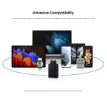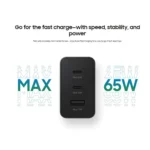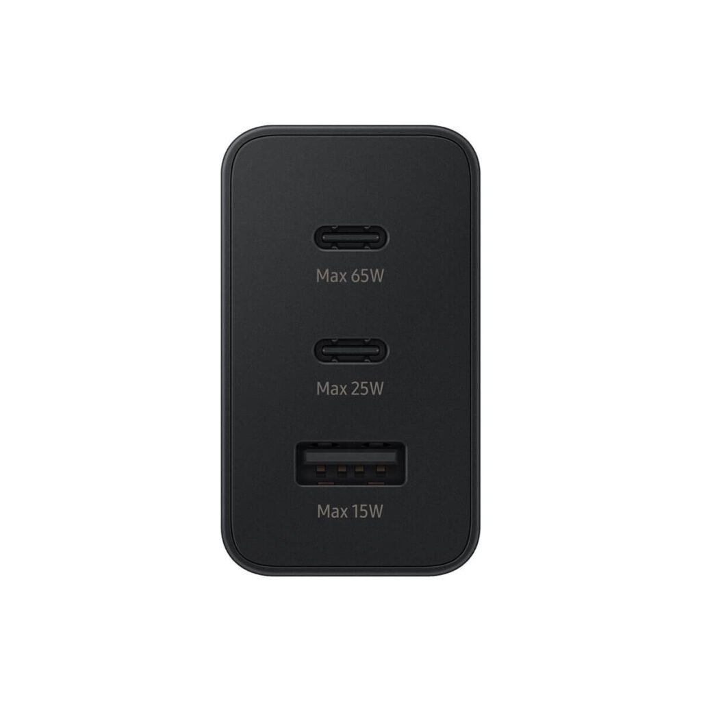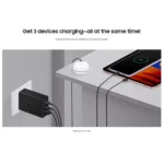 Adaptor can charge 3 devices simultaneously for a total of 65W power supply. Charging speeds vary depending on the number of devices. Requires When 3 devices are connected simultaneously the maximum power supply of each output will be: 35W, 25W and 5W.